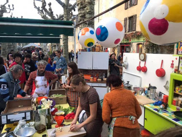 La soupe des gens, une soupe collective concoctée tous ensemble dans notre merveilleuse soupe'machine avec la complicité des associations du coin : légumes glanés, épluchage collectif et créativité !